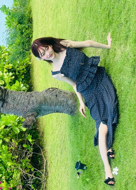 풀밭에 앉아 남색 민소매 원피스를 입고 레드 컬러로 염색한